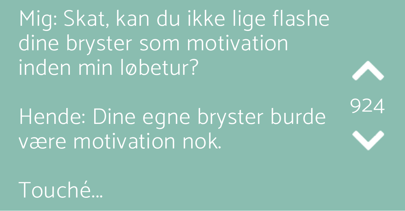 Mig: Skat, kan du ikke lige flashe dine bryster som motivation inden min løbetur? Hende: Dine egne bryster burde være motivation nok. Touché…